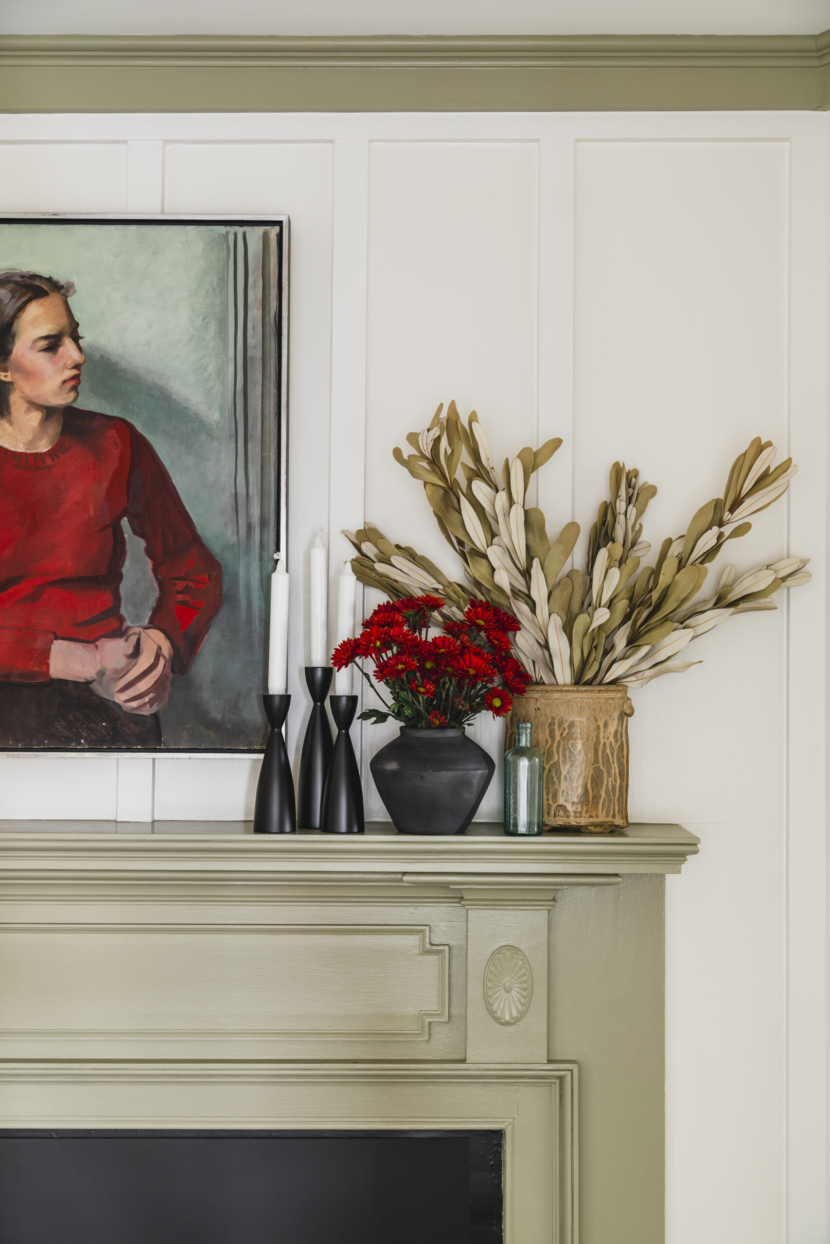 I also love the way Nantucket Gray looks with textiles in shades of russet red, brick and terracotta. Emily Starr paired it beautifully with a muted Prussian blue color on her mantle. Navy would also be really lovely with Nantucket Gray. Two of my favorite navy paints are Soot and Hale Navy by Benjamin Moore.