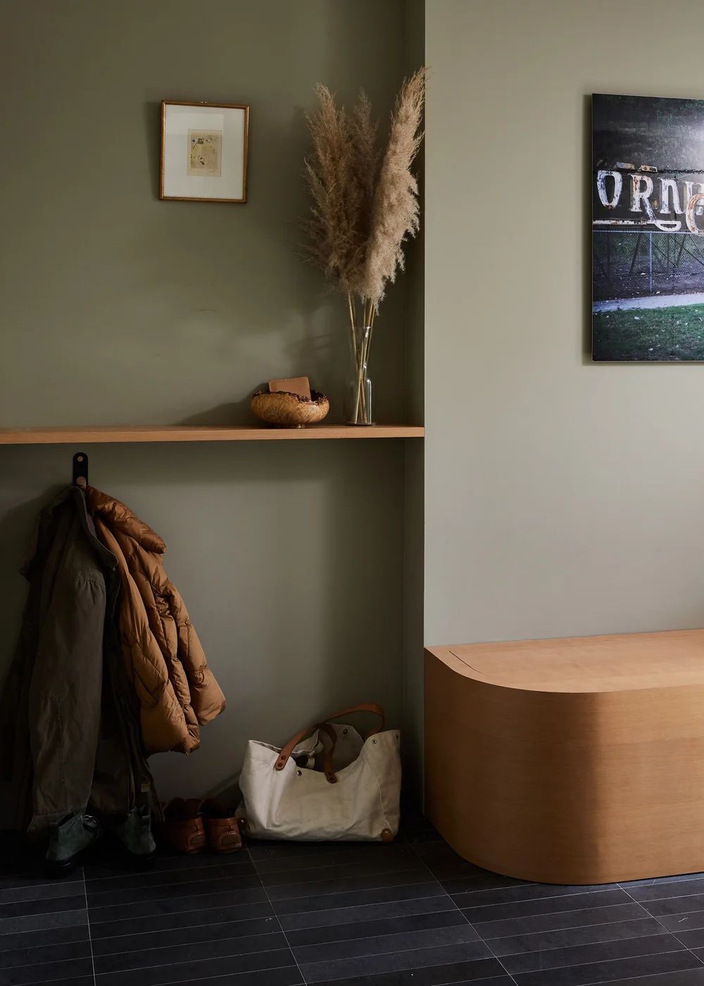 If using it for reverse trim like I did in my office, you could use Sherwin-Williams Wool Skein or Tapestry Beige by Benjamin Moore on the walls and the Nantucket gray on the trim, wainscoting and doors. For a contemporary look color drench your space with it and pair with White Oak like the below mudroom space from Shapeless Studio.