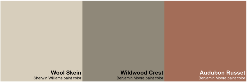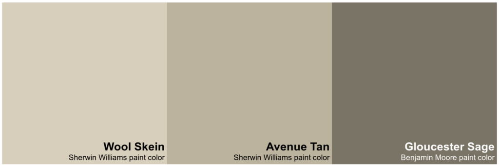 - Olives and Browns: The key is Wool Skein doesn’t like clean colors, so it’s best to pair it with a lower chroma brown or olive. I love using a higher contrast brown with it so don’t be afraid to pick a darker shade with an LRV in the 20s or lower.
